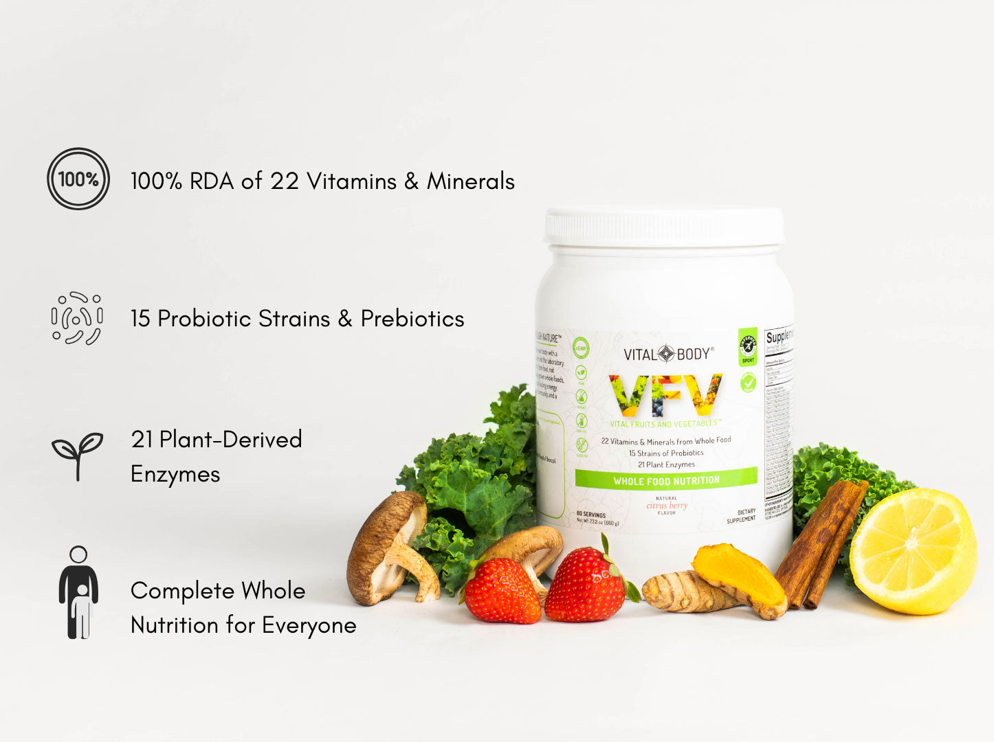 Introducing VFV (Vital Fruits & Vegetables): your daily powerhouse for peak performance! This vibrant blend delivers 37 fruits and veggies, 18 herbs and spices, plus prebiotics, probiotics, and plant-based enzymes. It’s NON-GMO, free from synthetics, sugars, and additives—pure, unadulterated goodness that tastes incredible.